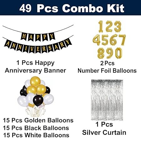 - COMPLETE COMBO KIT FOR ANNIVERSARY DECORATION : gold happy anniversary decoration kit packet include 1pc Black happy anniversary banner (made of thick paper – cardstock) , gold Metallic Balloons, black metallic balloons, white metallic balloons kit for anniversary decorations at home or bedroom.