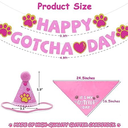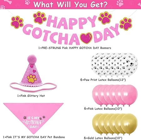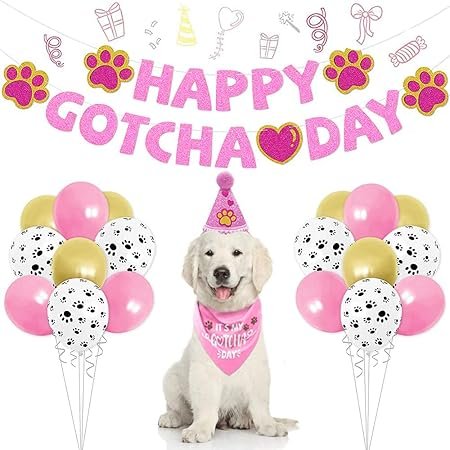 • Best Gotcha Day Dog Decor Set:The package includes 1 x It’s my gotcha day dog bandana, 1 x cone hat, 1 x happy gotcha day banner, 6 x Paw printing balloons, 6 x pink balloons, 6 x golden balloons. Provides a wonderful gift for your lovely dogs upgrade your pet dress up.