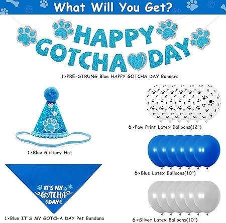 - Best Gotcha Day Dog Decor Set:The package includes 1 x happy gotcha day banner, 1 x cone hat, 6 x paw printing balloons, 6 x blue balloons, 6 x gray balloons, and 1 x birthday boy dog bandana. Provides a wonderful for your lovely dogs upgrade your pet dress up