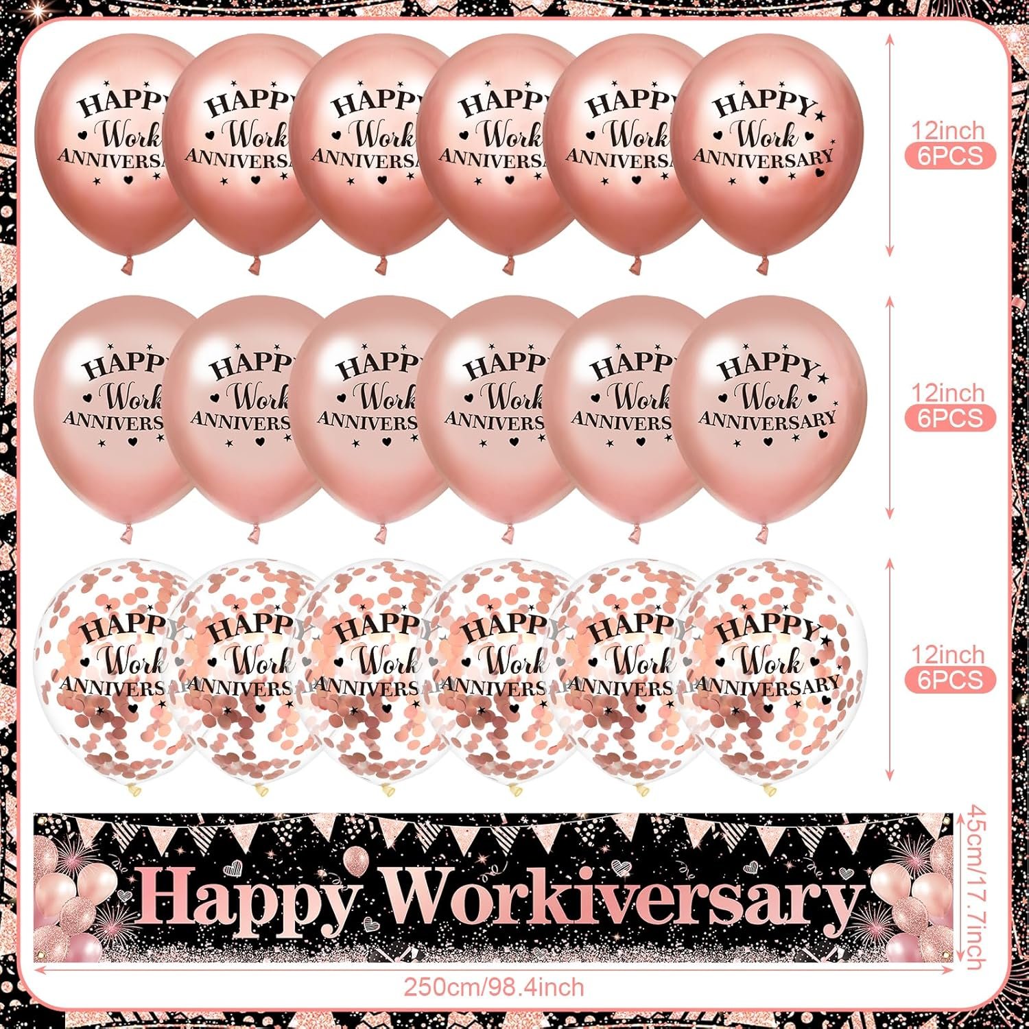 - 🎊Complete Thank You Set: This pack includes 1 large rose gold Happy Work Anniversary banner measuring 98 x 18 inches and comes with 18pcs 12inch latex balloons with Happy Work Anniversary patterns. Elevate your gratitude with our We appreciate you banner set