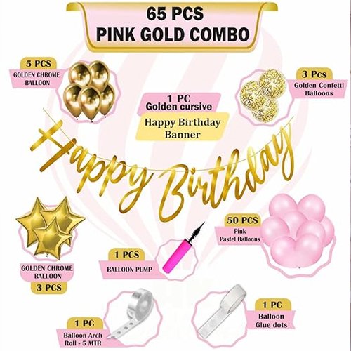 - Birthday decoration set for girls package includes :- Golden italian Card Stock Paper banner , 50 pcs pink balloons , 3 pcs golden confetti, 3 pcs star shaped foil balloons , 5 pcs golden chrome balloons , 1 pcs balloon arch and 100 glue dot with balloon pump
