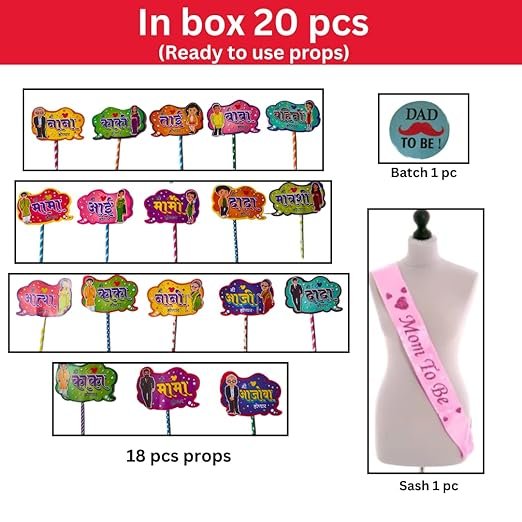 HK Balloons Baby Shower Family Photo Booth Party With Mom toBe Sash and Dad toBe Pin Badge For baby shower props Party Photo Booth Board Marathi Baby Shower Set Kit For Pregnancy Photoshoot Decoration