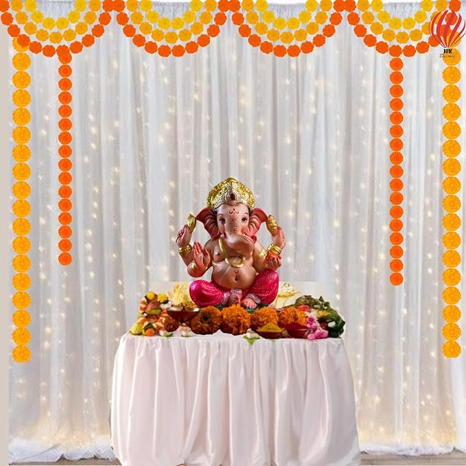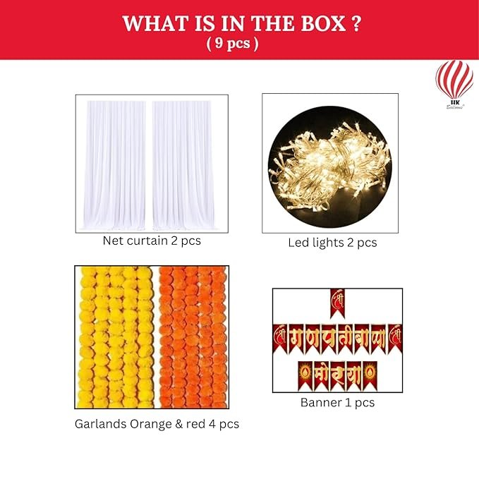 HK Balloons Ganpati Decoration Set: Ganpati Bappa Moray Banner, Net Curtain Backdrop, LED Lights, Genda Phool – Multicolor, Traditional Indian Festival – 9 Piece