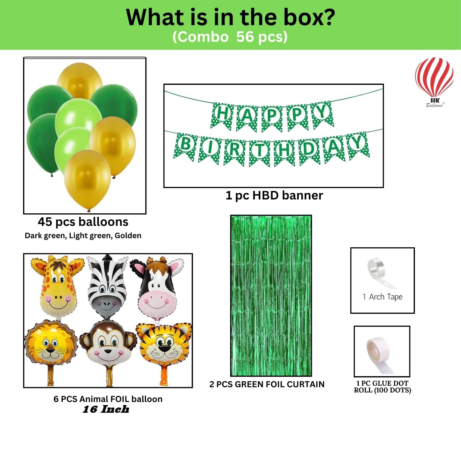 Birthday Jungle theme decoration for boys includes :- Green polka dot Happy birthday foil banner , 45 pcs jungle themed green golden balloons , 100glue dots , 1 balloon arch strip , 6 Animal face foil balloons ., 2 Geen foil curtains .Birthday Jungle theme decoration for boys includes :- Green polka dot Happy birthday foil banner , 45 pcs jungle themed green golden balloons , 100glue dots , 1 balloon arch strip , 6 Animal face foil balloons ., 2 Green foil curtains |