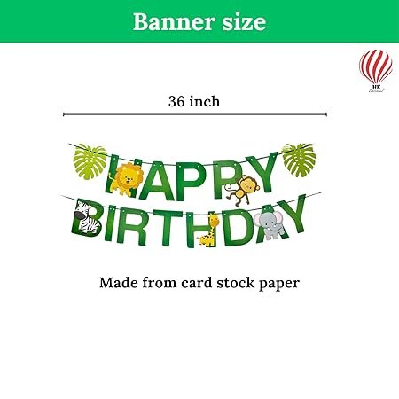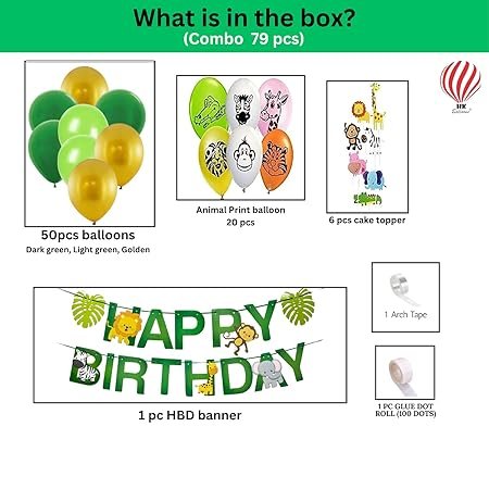 Birthday Jungle theme decoration for boys includes :- Green polka dot Happy birthday foil banner , 45 pcs jungle themed green golden balloons , 100glue dots , 1 balloon arch strip , 6 Animal face foil balloons ., 2 Geen foil curtains .Birthday Jungle theme decoration for boys includes :- Green polka dot Happy birthday foil banner , 45 pcs jungle themed green golden balloons , 100glue dots , 1 balloon arch strip , 6… See more |