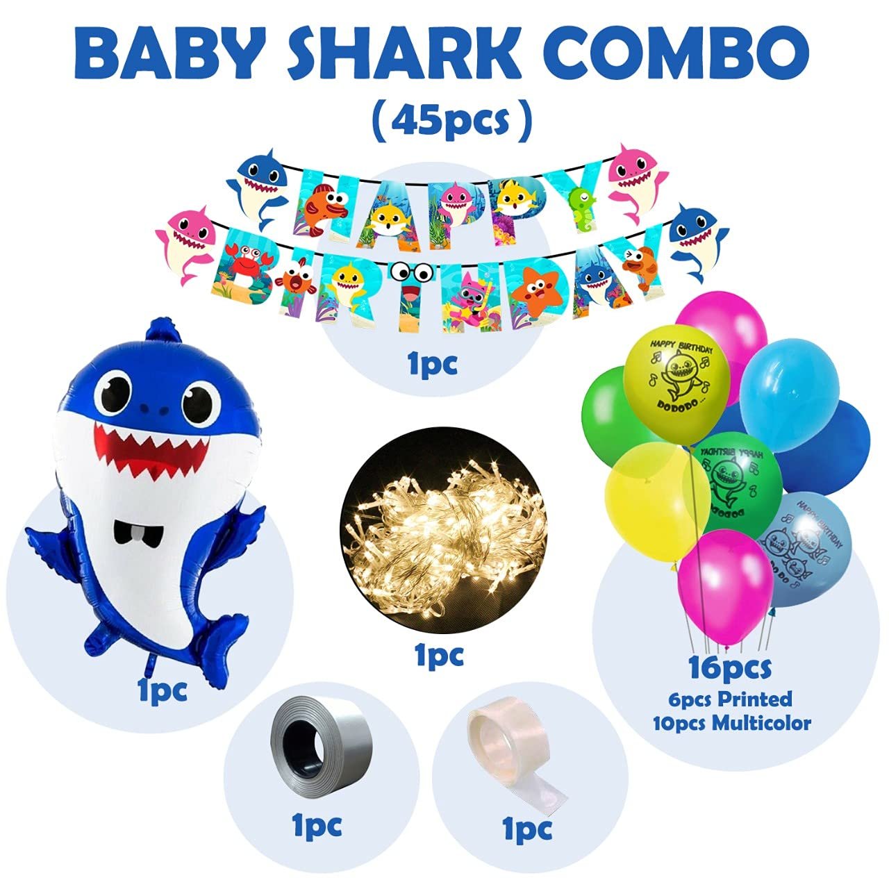 • VALUE FOR MONEY WITH FOIL BALLOON: The cute and beautiful baby shark birthday party kit has 45Pcs items with baby shark happy birthday banner,1Pc 26″ baby shark theme Foil balloon, 6Pcs baby shark printed balloons, 10Pcs metallic balloons, 1Pc Fairy string light, 1Pc balloon glue dot, 1Pc balloon ribbon for baby shark theme birthday decorations for .