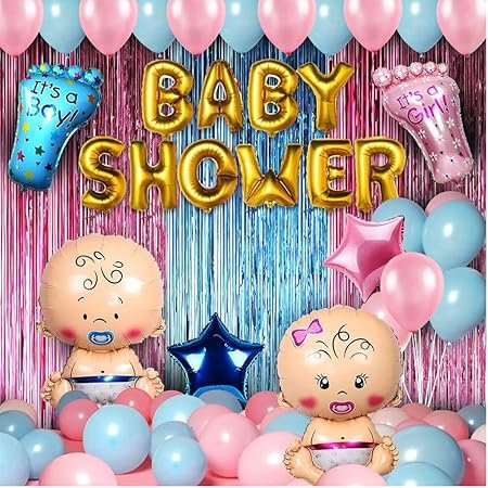- LARGE SET FOR COMPLETE PARTY DECORATION: The Party Propz Baby Shower Combo Decorations Set is a complete set of 50 pieces, including 1pc baby shower foil balloons, 2pcs baby foil balloons, 2pcs star foil balloons, 2pcs it’s a foot foil balloon, 2pcs pink foil curtain, 1pc blue foil curtain & 40pcs (20pcs + 20pcs ) latex baby shower balloons, allowing you to decorate a large space with ease.
