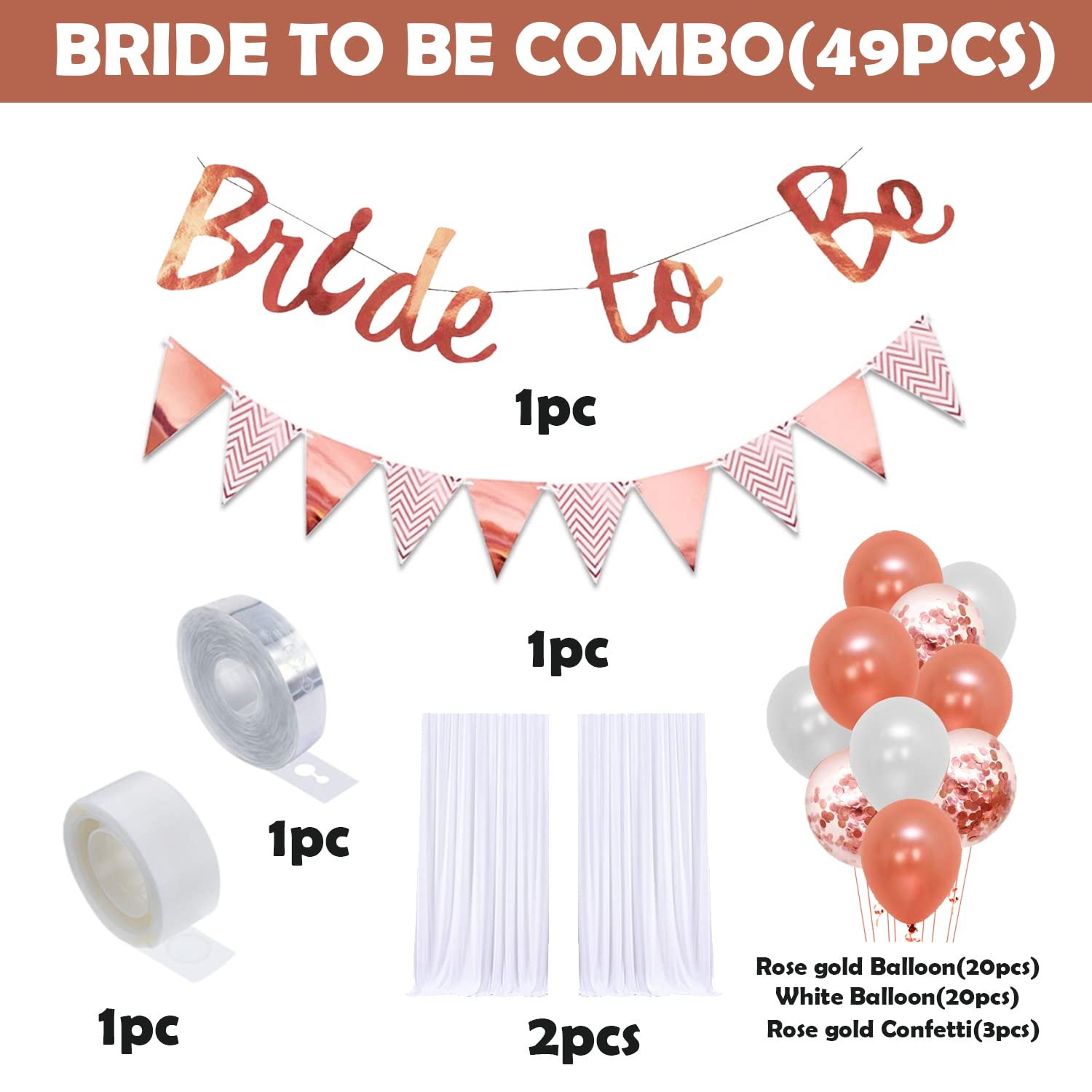 - EXCLUSIVE BRIDE TO BE DECORATION SET ALL IN ONE BOX – The bridal shower decorations pack includes everything we require to set up a beautiful decoration for your bride to be before the marriage. The packet includes 1pc rose gold bride to be foil banner, 1pc rose gold pennant banner, 20pcs rose gold metallic, 20pcs white metallic balloons, 3pcs rose gold confetti, 2pcs net, 1pc glue dot and 1pc arch roll.