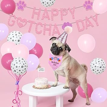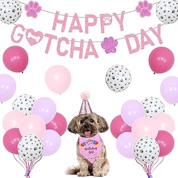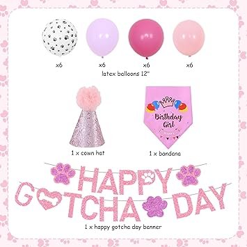 - Happy Gotcha Day Decoration: Include: 24pcs latex balloons,1pc happy gotcha day banner, 1pc bandana 26’*18” and 1pc cone hat.
